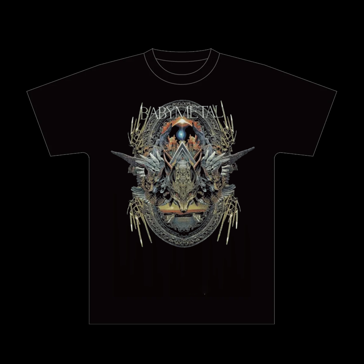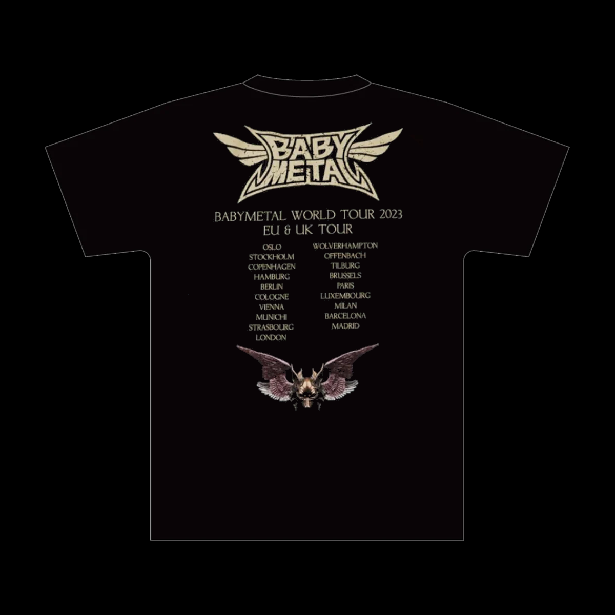 Fox Archways Tour 2023 design featuring U.K. and European cities is printed on a 100% cotton, unisex black tee.